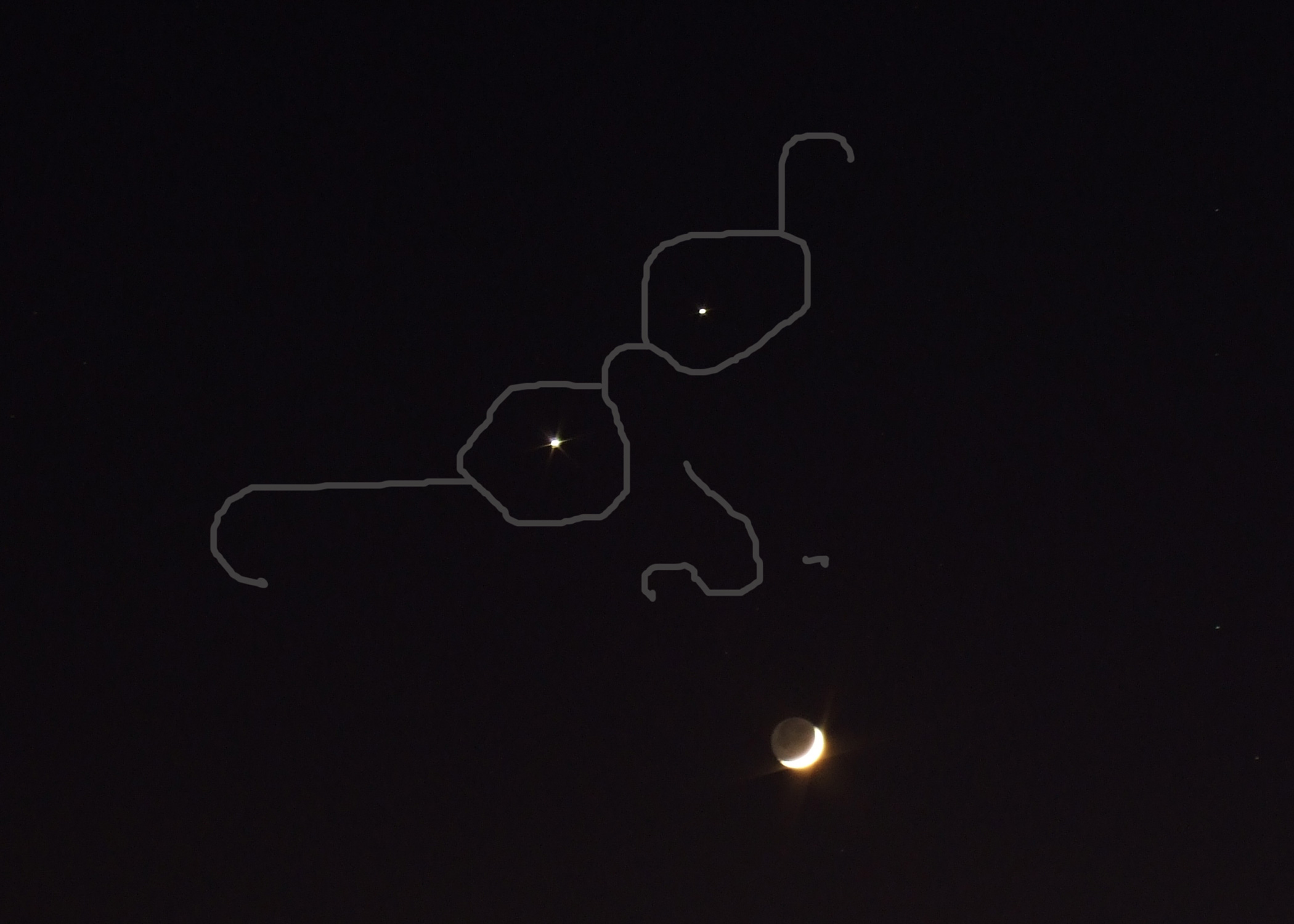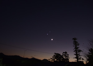 | 平成20年12月1日夕方、南西の空に月と明るい星が二つ。まるで微笑んでいる人の顔を連想させる。2つの星は、左下が金星、右上が木星とのこと。前々日には下に金星、上に木星と垂直に並んでいたことからすると、毎日大きく変わるらしい。翌日の山形新聞朝刊にも、写真が掲載されており、チャンスに恵まれたようだ。拙宅一階屋根の上で、カメラを三脚に固定して撮影。 | |