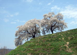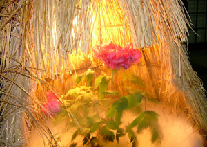 | この頃山形県南の高畠町では「冬咲きボタンまつり」が行われる。ワラで作ったコモの中のボタンが裸電球に照らされ、暗闇の中に浮かび上がるさまは、幻想的!・・・ 寒い冬を乗り切ると、北国の春は桜などの花々が一斉に咲乱れる季節になります。 |