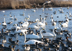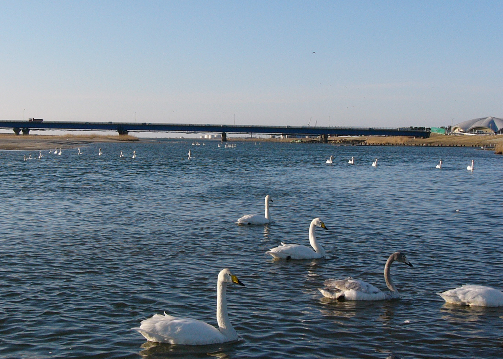 | さすが出羽富士と呼ばれるだけあって成層火山の美しい姿!・・・この山の雪解け水が伏流水となって日本海に流れ込み、夏に岩ガキが食べられるらしい。2月の鳥海山を撮影した時は、最上川河口の白鳥を見に行った帰りだった。その際の写真を2枚ほど・・・ | |