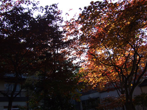 | ナウエモンの事務所から北方約1.2km、小高い山の上に羽黒神社があり、昼の散歩の折返し点として時々参拝をしています。2008/10/13、その山の南側斜面で季節外れの桜が3輪咲いた、とのTV放送がありました。翌日早速散歩に出掛け、急な斜面を登ってカメラに収めることができました。 秋の写真がなぜか少ないのは、何処ででも紅葉が見られるからかも知れません。泊まった宿の庭で撮った唯一の紅葉の写真です。 |